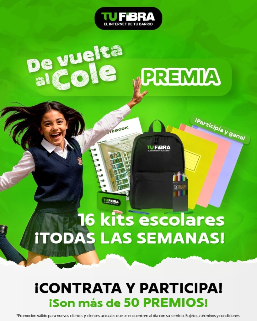 Si te vuelves cliente de Tu Fibra entre el 17 de febrero y el 23 de marzo de 2026 participarás por un sorteo de (1) kit escolar. El sorteo se realizará cada lunes a las 5:00 p.m. vía el canal de Facebook de TuFibra. Y, también participan todos los clientes que estén al día en su pagos.